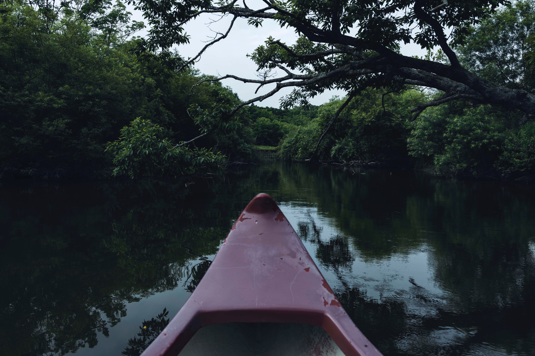 早朝、暗い時間から釧路川に向かい、ひとりカヌーに乗りこみました。岸を離れてすぐにその異様なほどの静けさに気がつきます。波もなく、風もなく、木々が揺れて葉っぱが擦れる音さえしないのです。ただ、ぴちゃぴちゃとパドルが川面を叩く音だけが響いているだけでした。