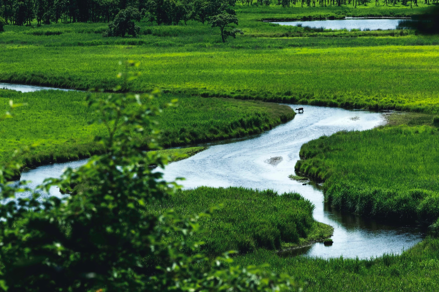 さらに歩いて森を抜けると見晴らしのいい丘にでました。どこまでも続く湿原をしばらく眺めていると川に一頭のエゾジカが水を飲みに来たのです。今、きっとぼくが見ている風景はかつてアイヌの人たちが見たのと同じ風景なのでしょうね。ここにはまだ何千年も変わらない世界がありました。街からたった数時間離れただけなのにこんな場所があるなんて、とても不思議な気がします。